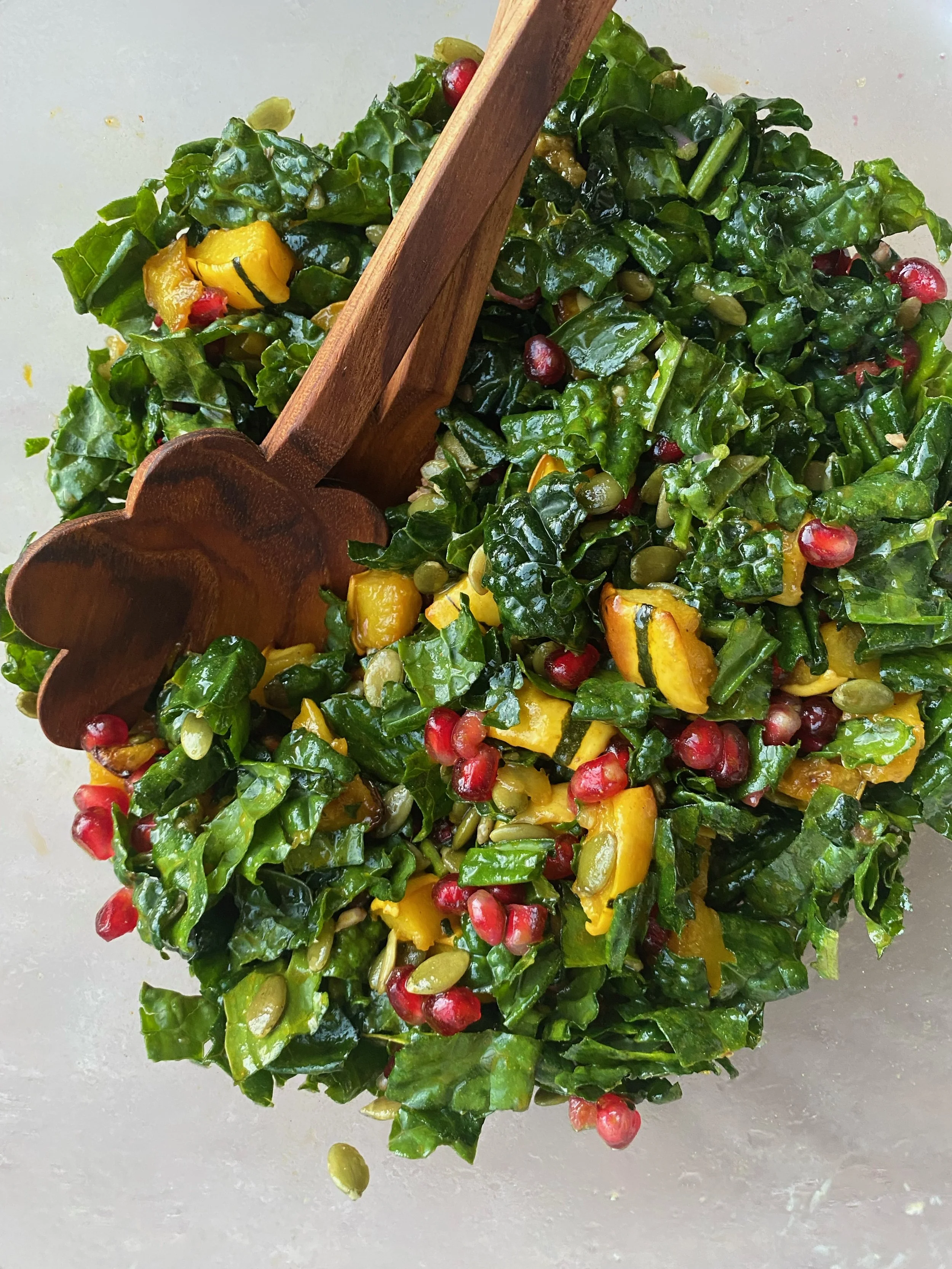 While the squash is roasting, in a large bowl, add the coconut oil to the chopped kale leaves and massage for two to three minutes with your bare hands so it is softened, bright green and more easily digested so your body can access the nutrition within.